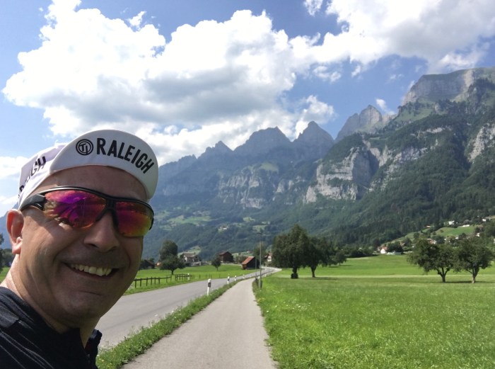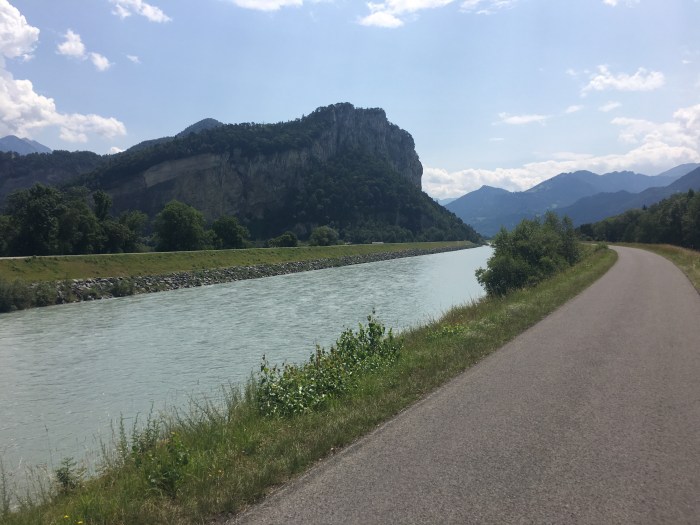 The formidable Alps loominged arround me. i have a love affair with those big giants. Often flanked by rivers and streams swollen ,the road drove steadily downer and the slight nip in the air turned into a downright chill. i cycled for ours across the river Rijn. in Straight lines, the sun high in the sky burning my skin and Wind in my face who burned my legs. But it was fun! Ours driving between cornfields , open landscapes. Sometimes a E bike who crossing you.